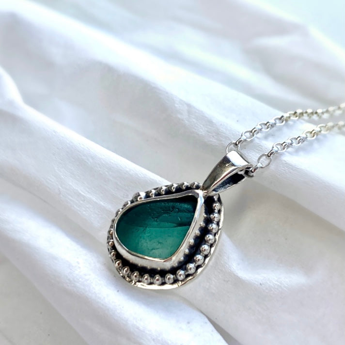Seaham* green multi sea glass 'open' set into a silver bezel to allow the light to shine through, showcasing the glass's true beauty.