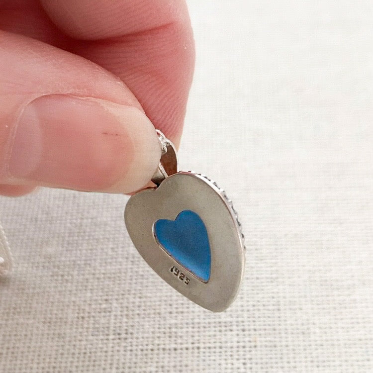 Leaving the top surface of the sea glass untouched, I have hand carved a beautiful piece of cornflower blue sea glass into a beautiful heart. This elegant design allows the light to shine through, as there’s a cut out heart design on the reverse of the pendant.