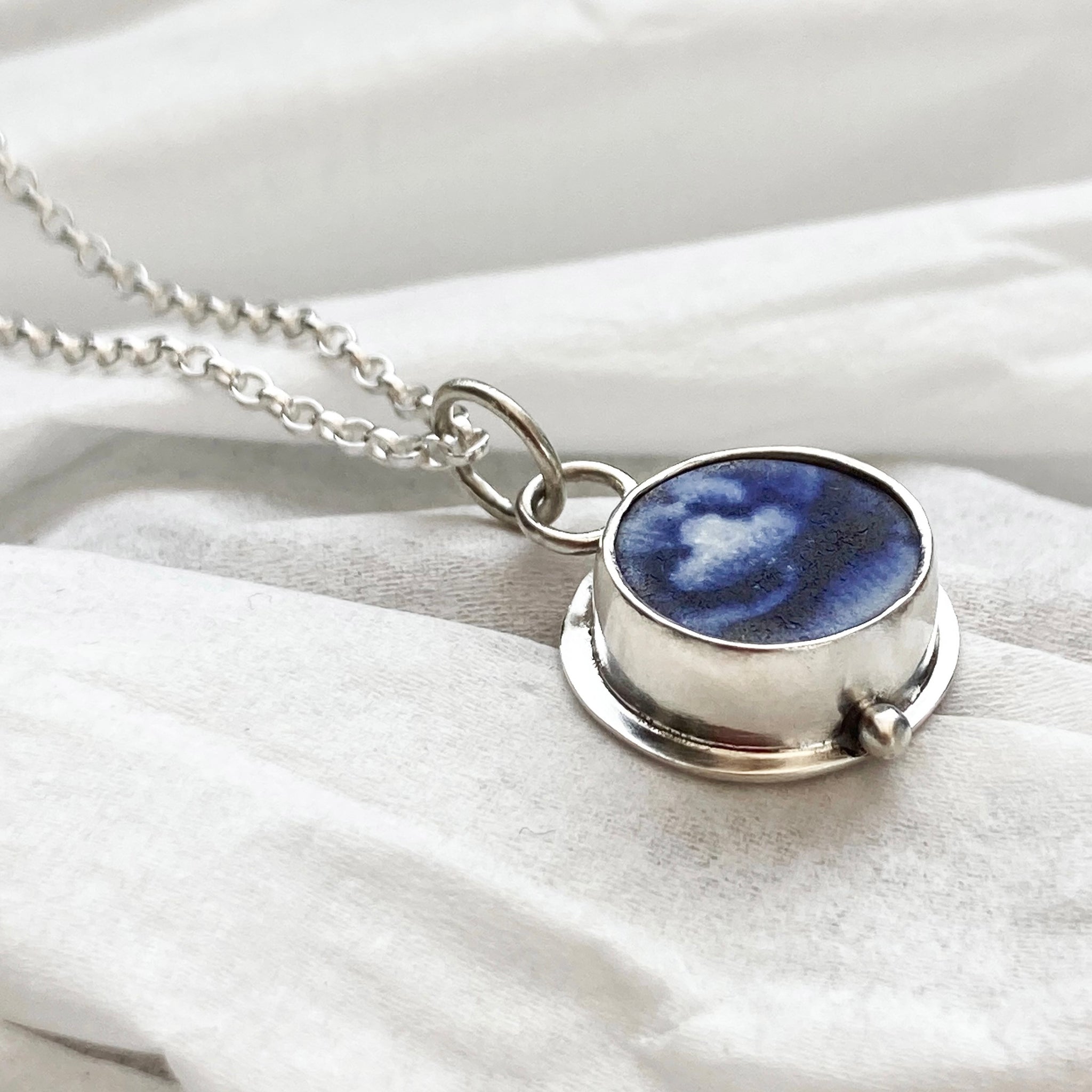 What starts as a found piece of beach pottery, naturally tumbled by the sea, is then meticulously hand shaped into a contemporary circular shape, before being set into sterling silver. Each piece is completely unique, with its soft, weathered surface telling a story of the shoreline. A timeless coastal treasure — perfect for anyone who carries the ocean close to their heart.