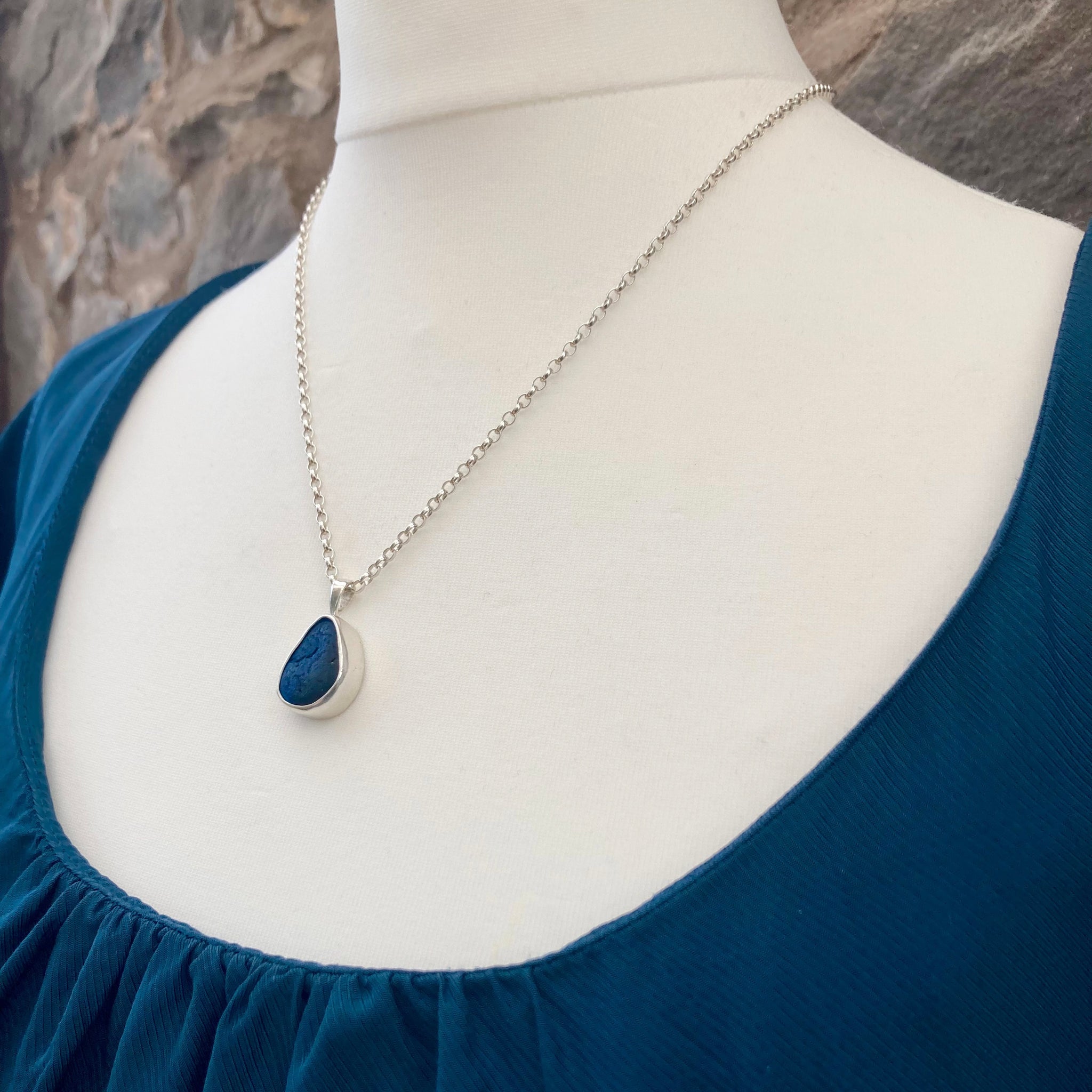 Stunning Seaham blue multi sea glass 'open' set into a silver bezel to allow the light to shine through, showcasing the glass's true beauty.